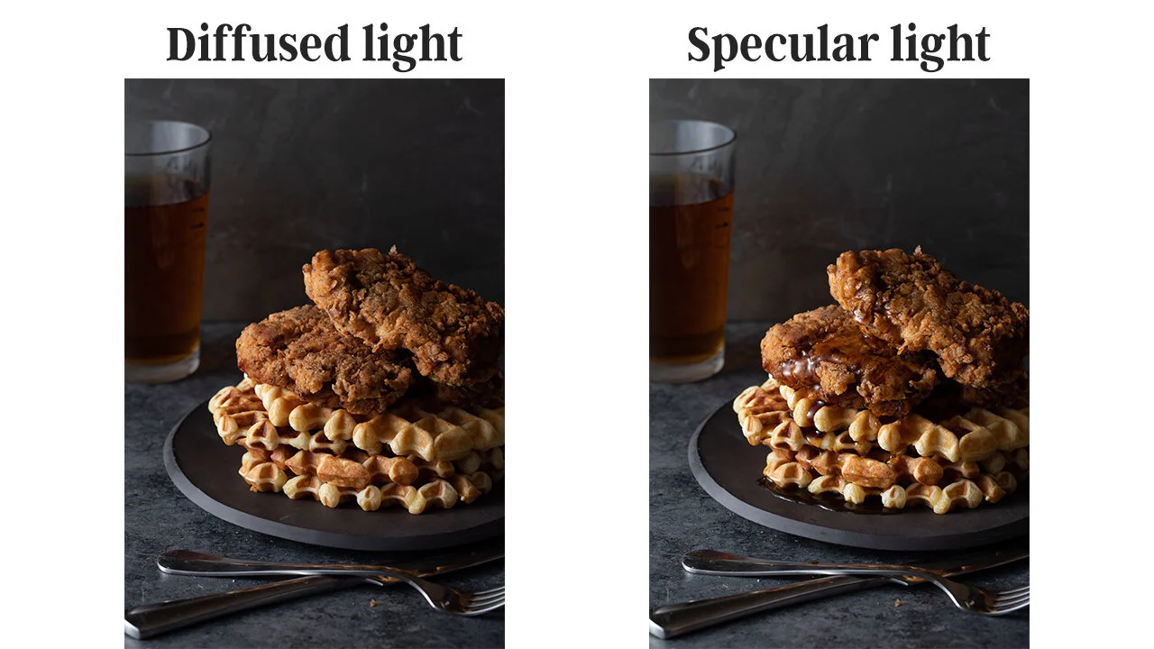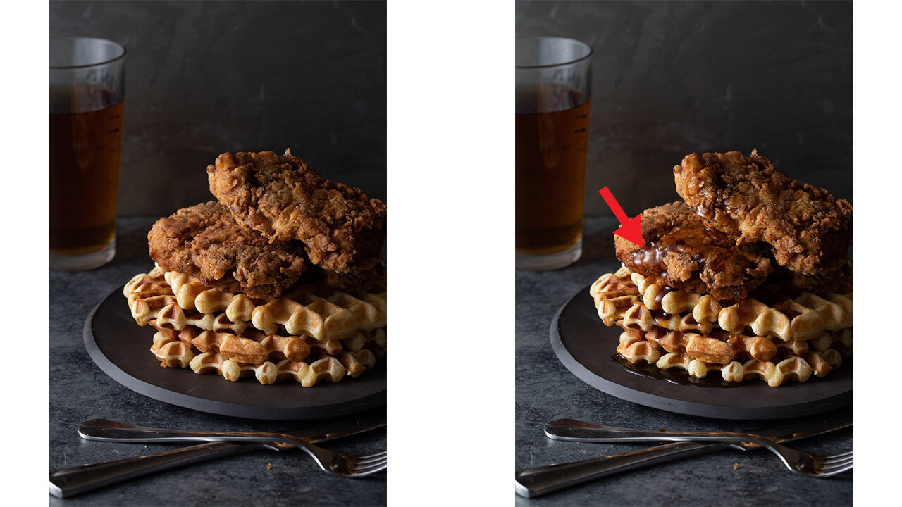 Simply put, it went from a"diffused" quality of light to a "specular" quality of light because of the nature of the syrup allowed for the light to reflect into the camera much more. On the other hand, the surface of the chicken and waffles scattered the light more and therefore cause a "diffused" type of reflection from them.